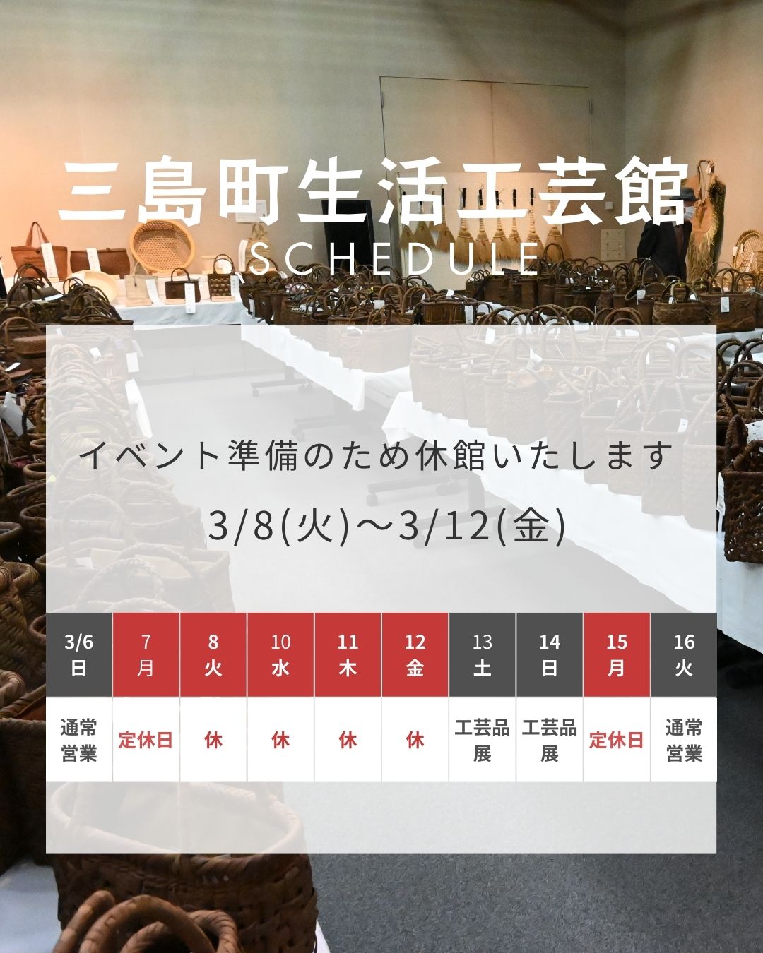 イベント準備のため休館いたします。3/10(火)~13(金) 2026.02.15 3月14日(土)・15日(日)開催のイベント準備のため、以下の日程で休館させていただきます。 休館日▷令和8年3月10日(火)~13日(金) ご来訪予定の方は、日付けをご確認のうえお越しいただきますようお願いいたします。 通常営業は、3/17(火)からです。 Tweet 0